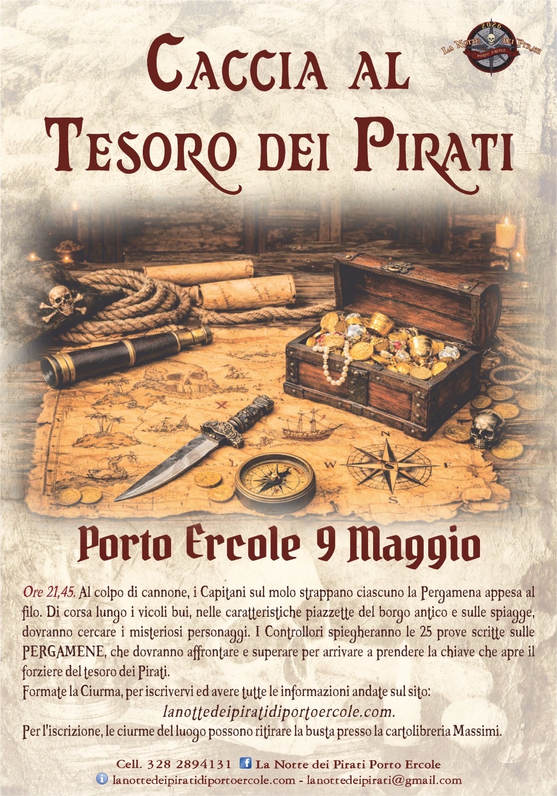 Il 9 maggio è incentrato sulla rievocazione serale con sfilata delle ciurme, scene di sbarco dei pirati, effetti scenici e spettacolo pirotecnico, cui segue la “Caccia al Tesoro dei Pirati” aperta al pubblico organizzato in squadre. Le prove si svolgeranno tra il borgo antico e le spiagge, con un percorso a tappe che prevede enigmi e giochi tematici.