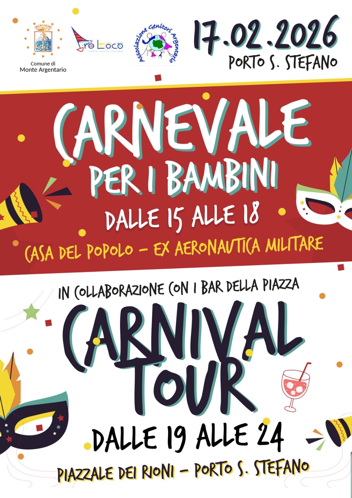 La festa continua la sera con il Carnival Tour: musica, energia e atmosfera di Carnevale nel cuore del paese.